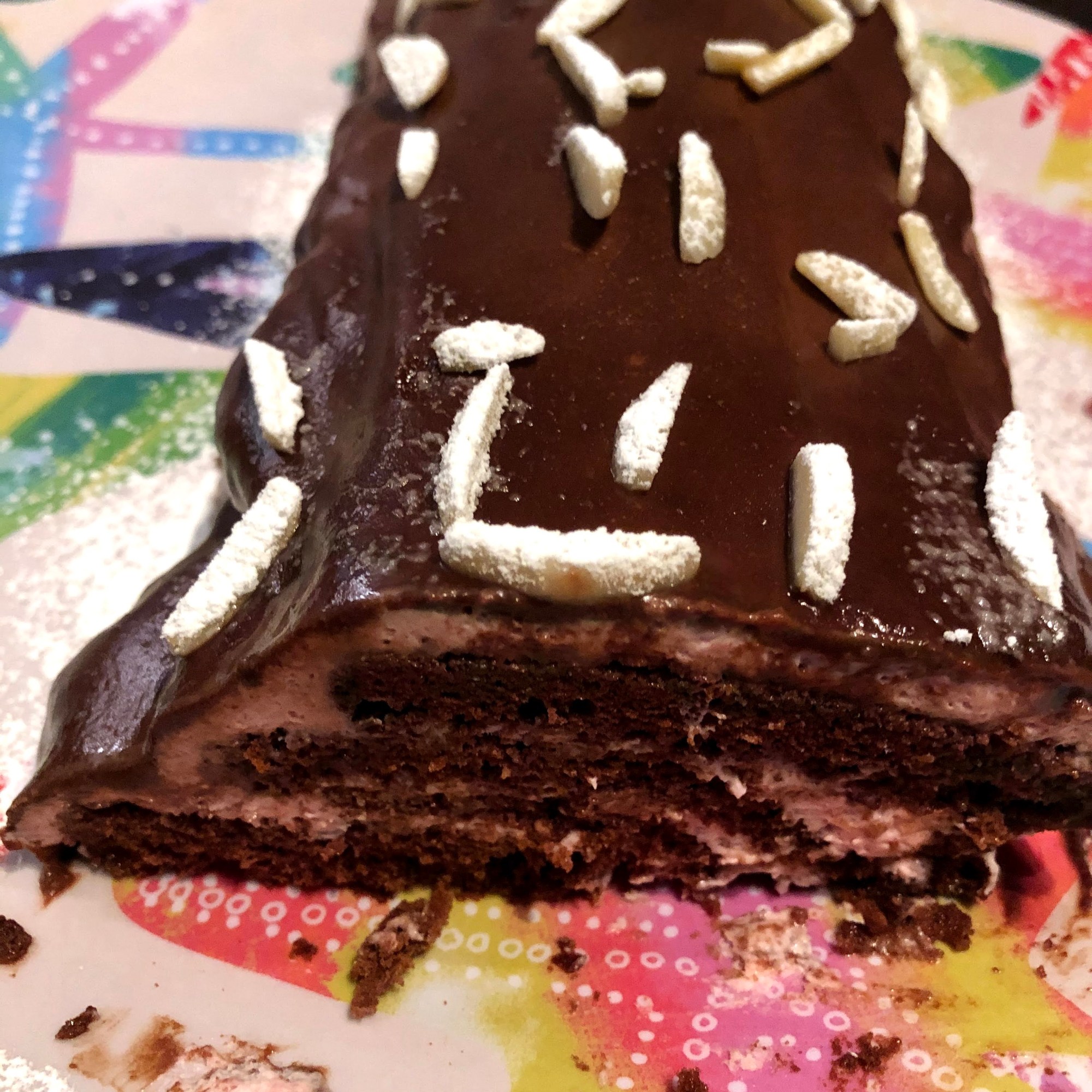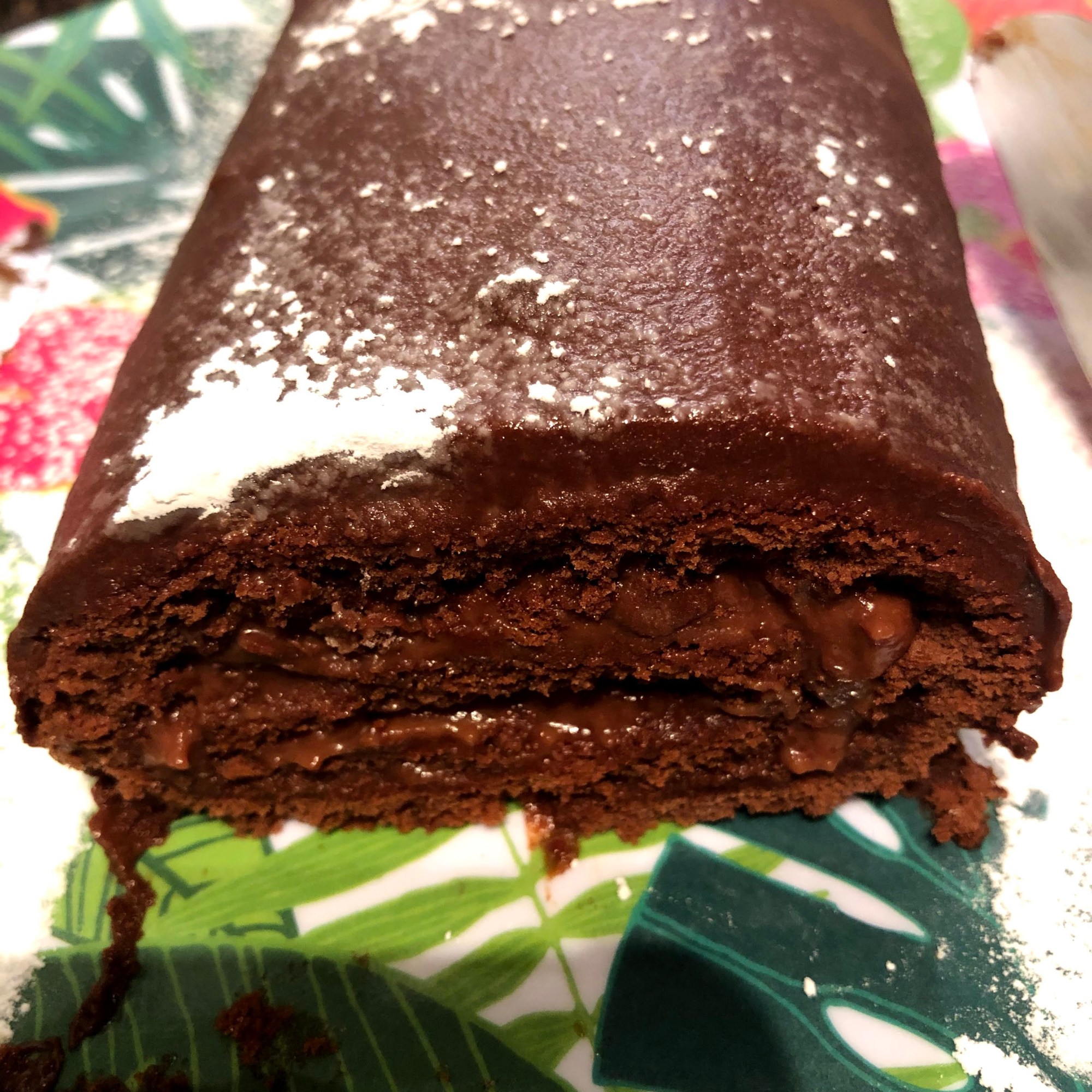 The cake appeared in France in 19th century, before spreading to other countries. It is a rolled genoise filled with a ganache… you can use a fork through the icing to reproduce the log texture and some powdered sugar to represent the snow.