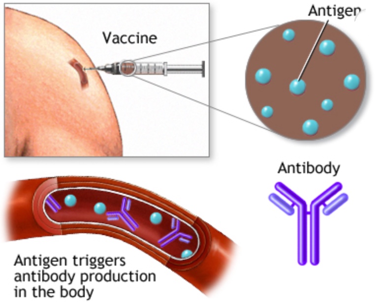If I am simplifying a lot what I remember from my old immunology classes (1997-98)…, a vaccination is the injection of a small part of a virus (or bacteria) in the body that triggers an immune response against it (via antibody activation) – and the result of this response is the protection against the virus. This is very simplified… this is what I remember but this is the concept !