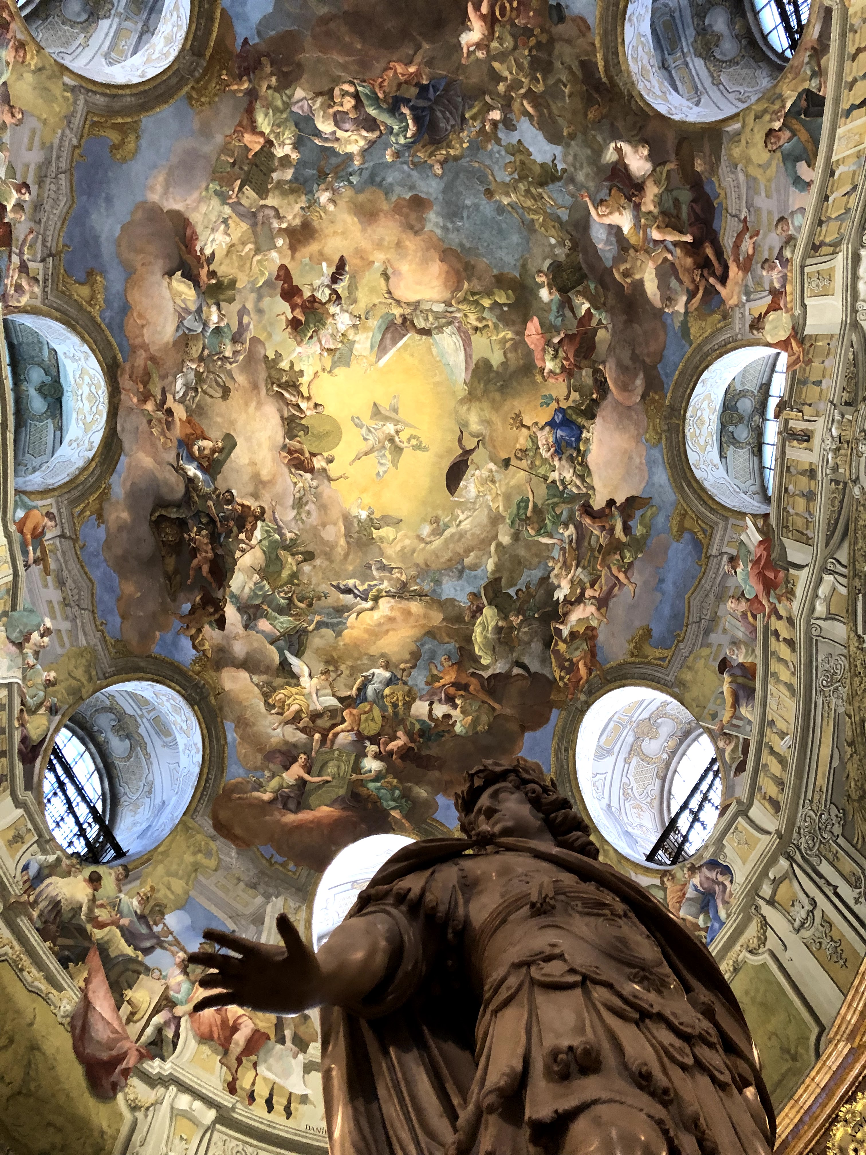 The ceiling includes a fresco in the central dome where the image of the emperor is held by Hercules and Appolo ( you can see the coin with the emperor face at the feet of the angel in the center).