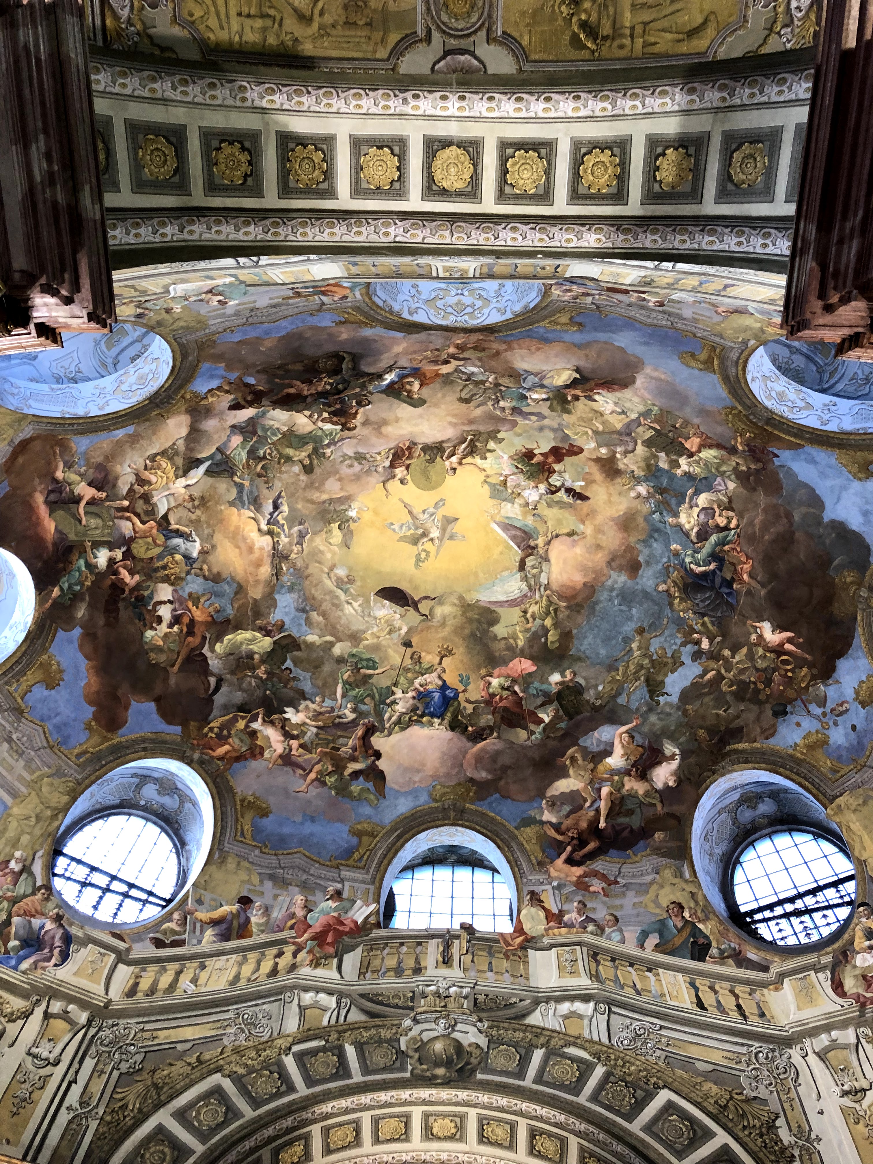 The ceiling includes a fresco in the central dome where the image of the emperor is held by Hercules and Appolo ( you can see the coin with the emperor face at the feet of the angel in the center).